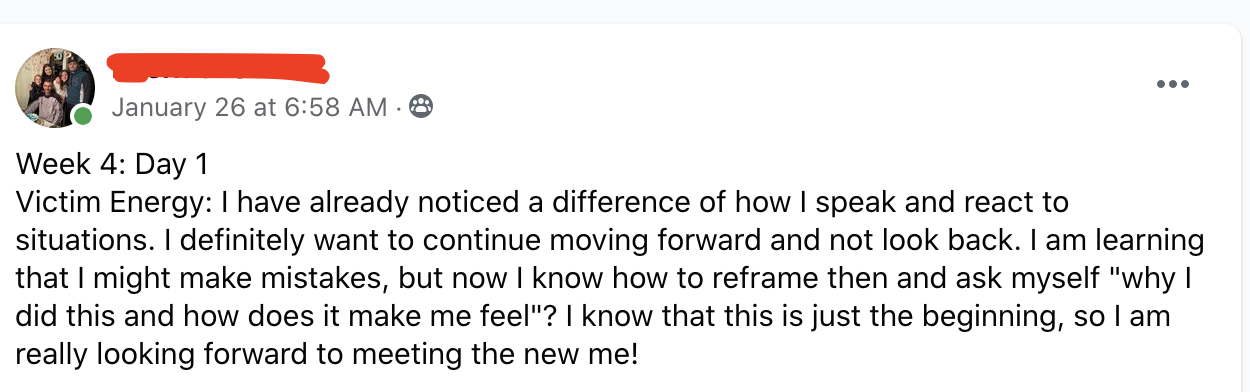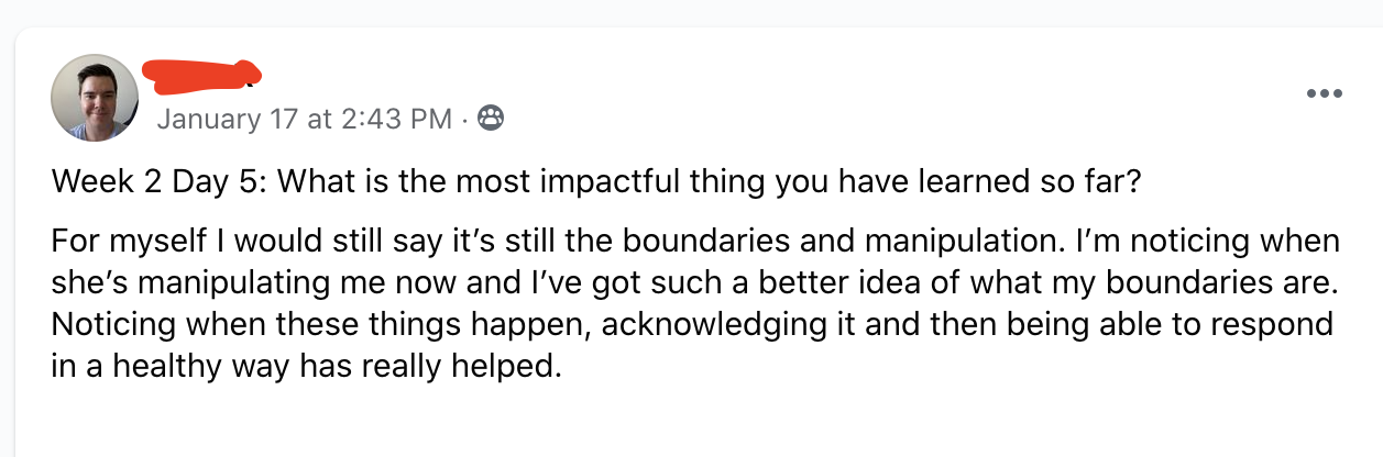 Every day, you'll start the challenge with a new video training meant to challenge your beliefs about yourself and your situation and help you dive into a new areas of understanding when it comes to boundaries, manipulation and your own healing journey.